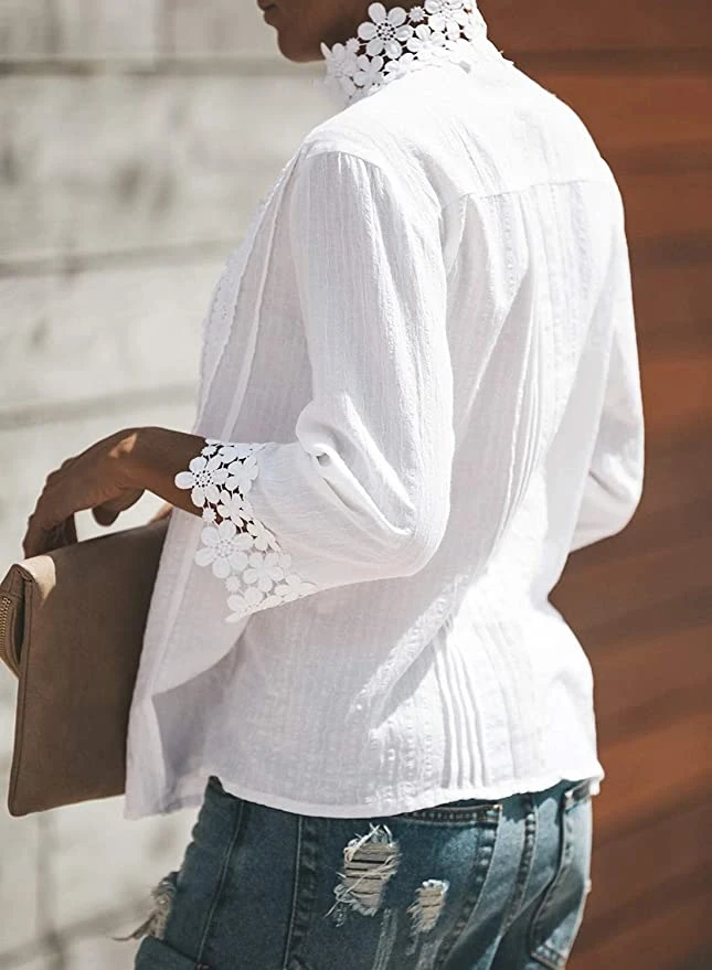 - Feature: Mock Neck, Flowy 3/4 Sleeve, Lace Crochet, Button Down, Applique Detail