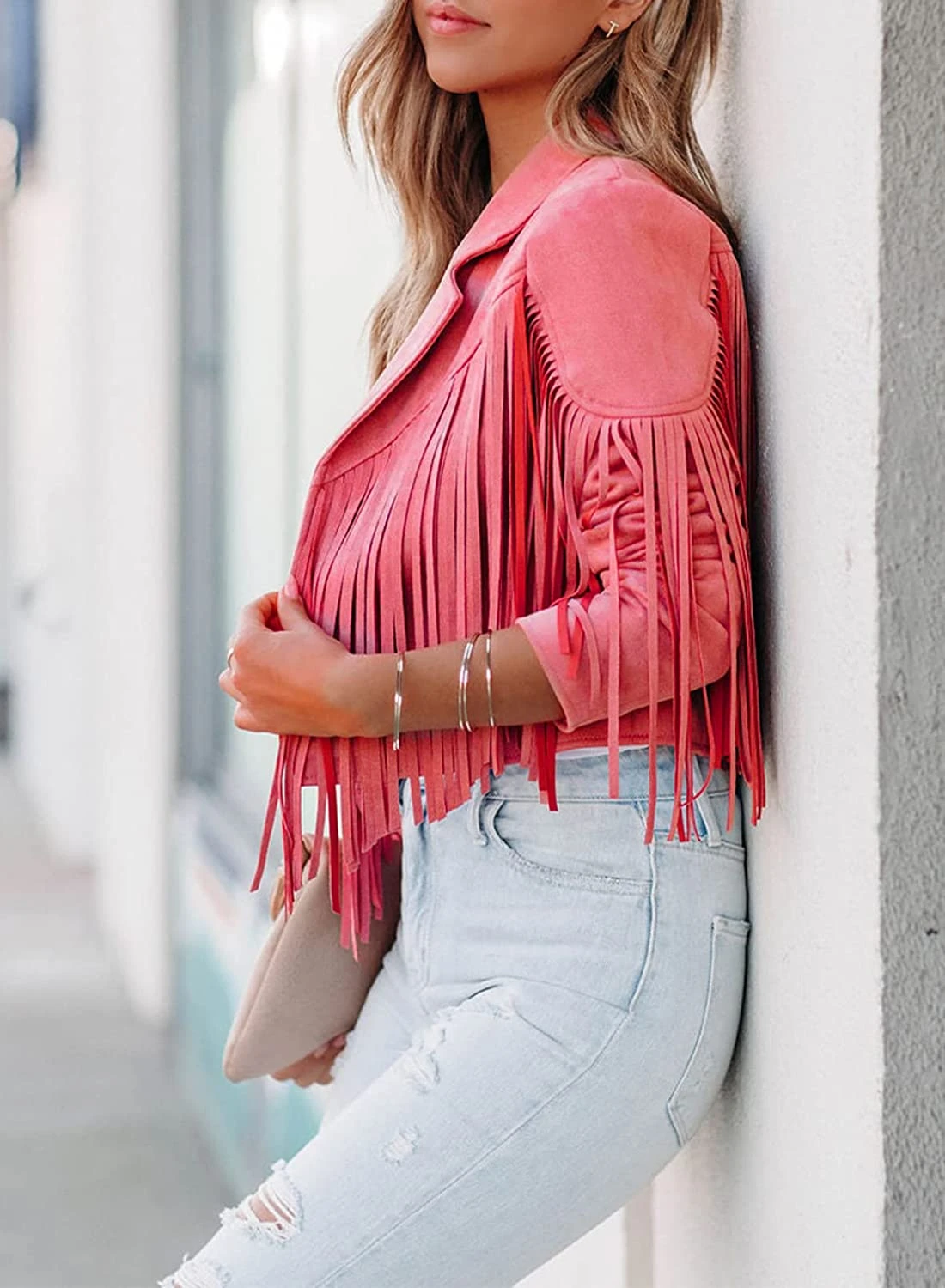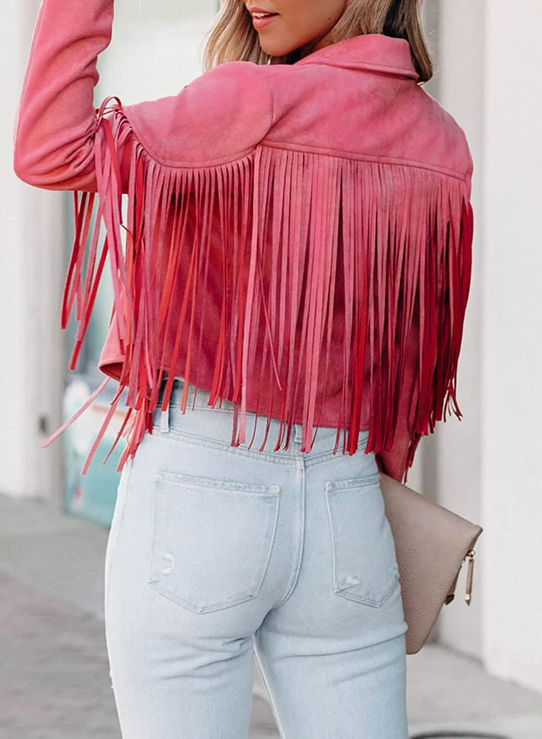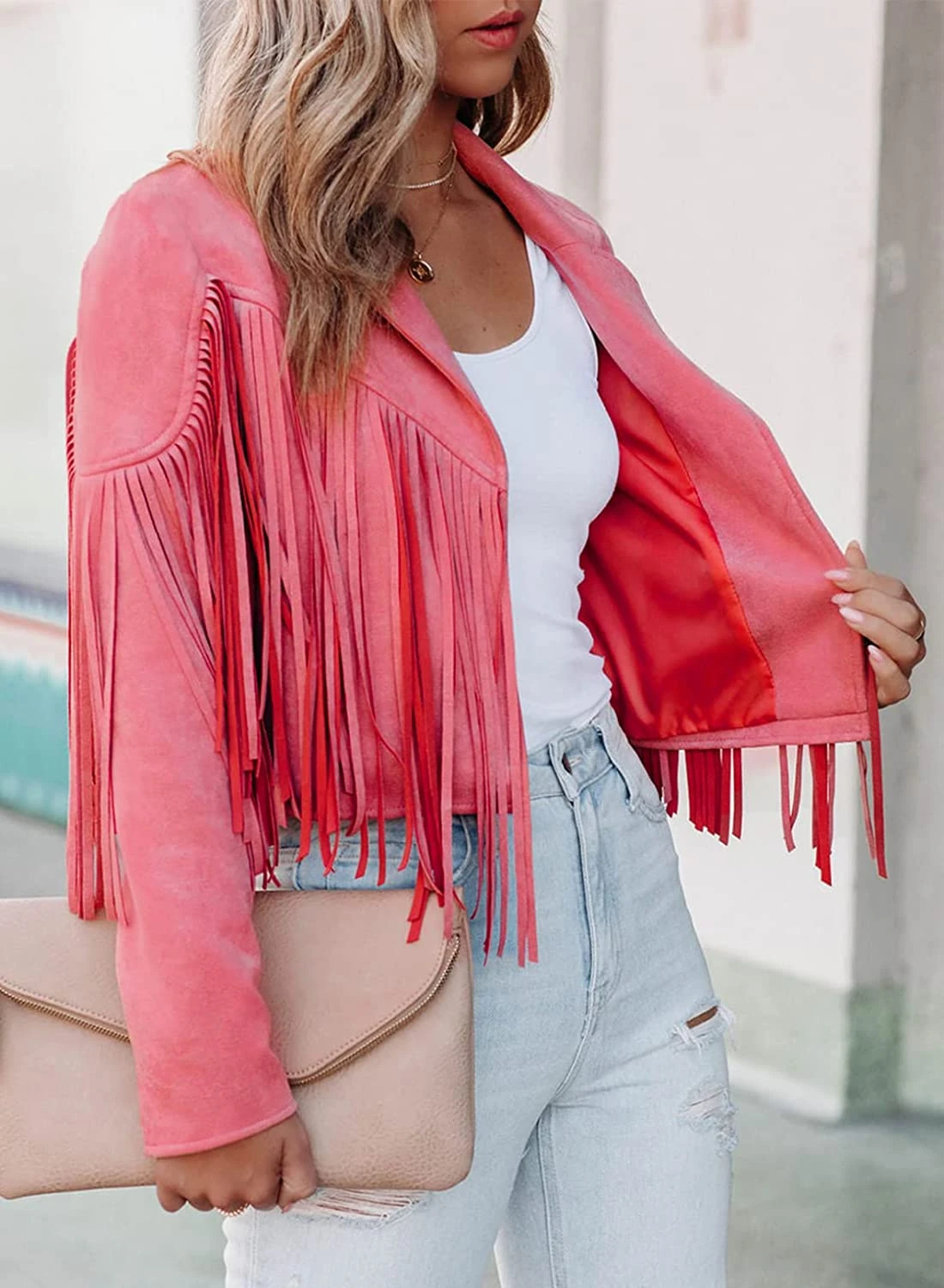 A Fringe Jacket so darling, even Dolly will be seeing stars! The Dolly Faux Suede Fringe Jacket features a buttery soft material, making it perfect to transition through seasons. Full fringe wraps from front to back, making it nearly impossible to stop yourself from twirling your way through any room or across the dance floor. Embrace the spirit of the wild west and cowgirl ways in three adorable colors, Pink, Creamy Beige, and Black, and pair it up with your favorite cutoff jeans and cowboy boots.Â
