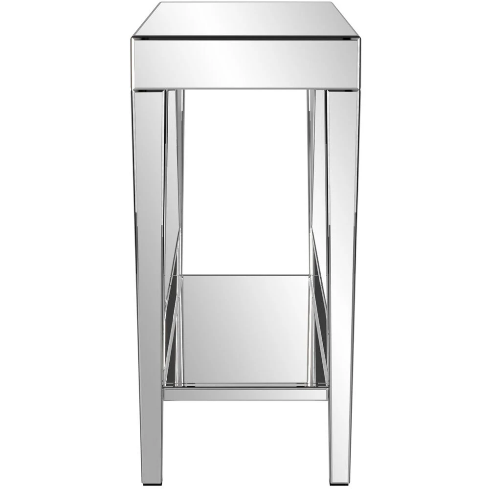 This console table features a simple rectangular shape with a completely mirrored body. The entire piece is mirrored making for the most beautiful displays of light and reflection. It has a bottom shelf for extra storage. Each mirrored panel has a small bevel that adds to the table’s style and beauty. This contemporary table will look great in an entryway, hallway, living room or any place you need a console table!