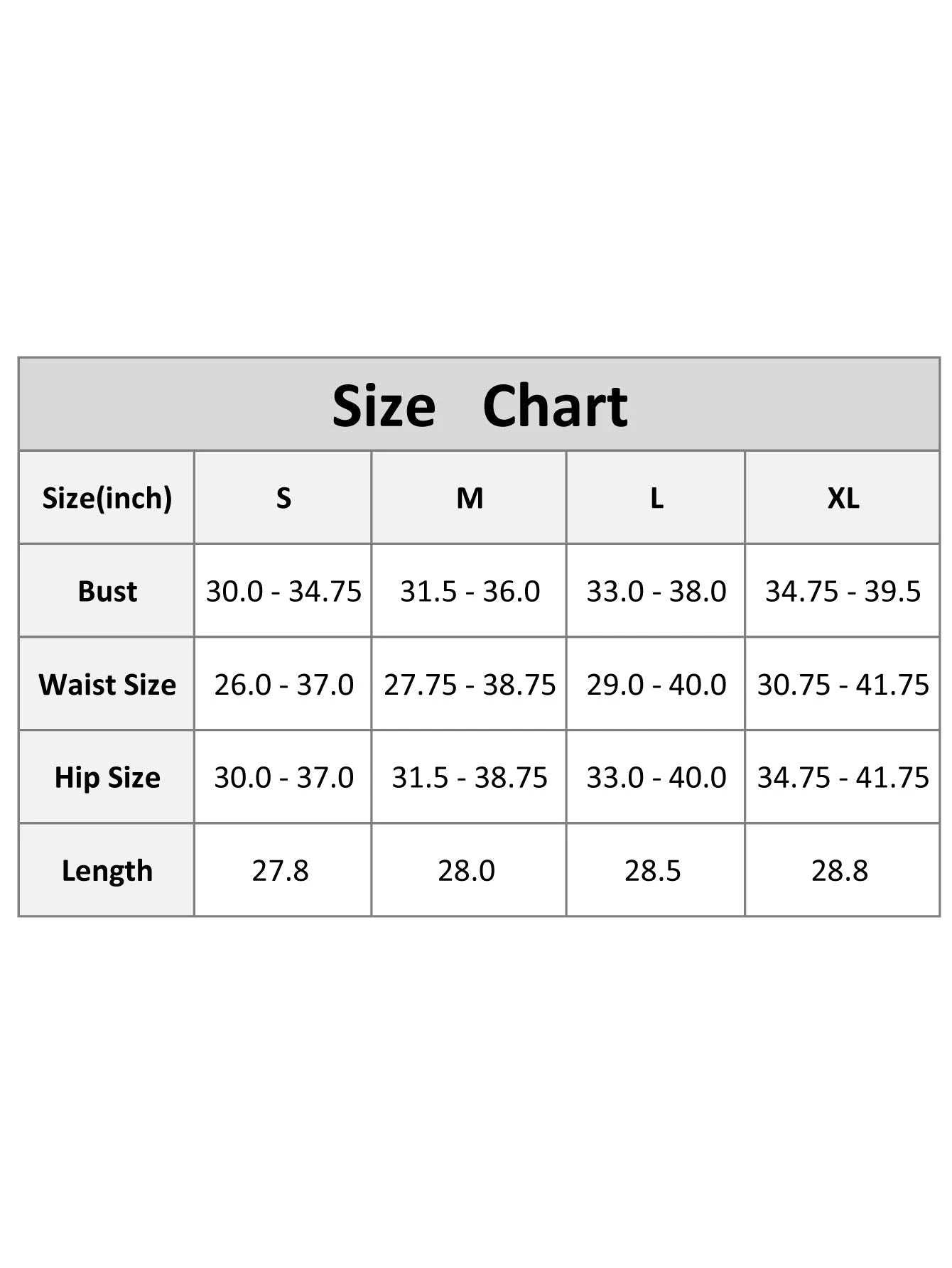 S—Bust:27.75-34.75 inch, Waist Size:31.5-36.0 inch, Hip Size:30.0-37.0 inch, Length:27.75 inch